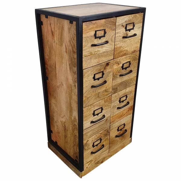 Der Hersteller hat bei dieser Kommode darauf geachtet, dass sie besonders praktisch und nutzerfreundlich ist. Hier sollen durch die durchdachte Ordnung alle verstauten Gegenstände schnell wiedergefunden werden. Dazu dienen insgesamt acht Schubladen, welche Maße von ca. (Breite / Tiefe / Höhe) 21,5 x 37 x 21,5 haben. Die Kommode selbst hat Maße von ca. ca. (Breite / Tiefe / Höhe) 60 x 45 x 110 cm, sodass sie die perfekte Größe hat, um in unterschiedlichen Räumlichkeiten eingesetzt zu werden. Neben dem wunderschönen Design kann der Apothekerschrank auch mit seiner Qualität überzeugen. Hier hat sich der Hersteller für die Verwendung von massivem Mangoholz in Kombination mit Metall entschieden, welches nun in echter Handarbeit verarbeitet wurde.